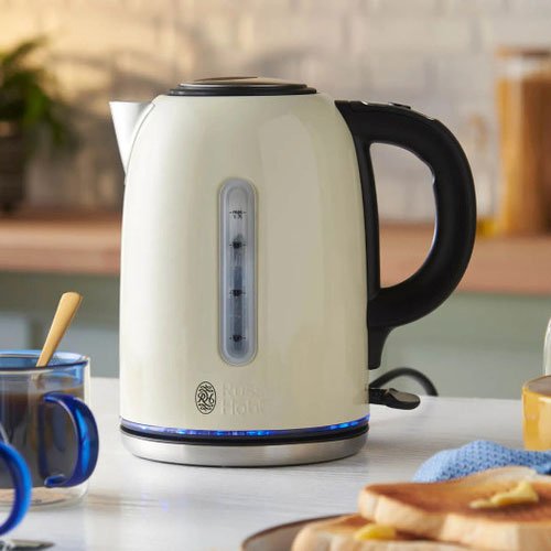 Shop the Russell Hobbs 1.7L Quiet Boil Kettle in Cream | 20461 for fast, efficient, and quiet boiling. Perfect addition to any kitchen setup.